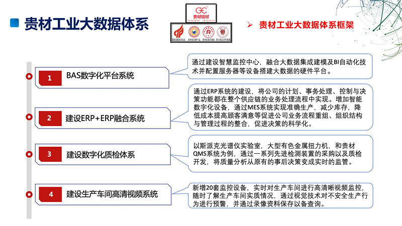 根據(jù)公司發(fā)展戰(zhàn)略,為推進科技進步,增強企業(yè)核心競爭力,加快公司發(fā)展,經(jīng)公司研究決定,于2021年01月01日成立貴材大數(shù)據(jù)中心。大數(shù)據(jù)中心建筑面積400平方,累積投資600萬,具備了生產(chǎn)排產(chǎn)調(diào)度,BAS數(shù)據(jù)智能分析模型,透明化車間監(jiān)控平臺,能源智能分析平臺,和數(shù)字化質(zhì)檢系統(tǒng)。貴材數(shù)據(jù)中心是由??低暎P派田@,微軟中國,東芝中國,TCL,貴材大數(shù)據(jù)部和貴州大學(xué)等多個優(yōu)質(zhì)軟硬件集成商和科研機構(gòu)的所共同打造的一個高度現(xiàn)代化的數(shù)字化成果,基于海量數(shù)據(jù)采集、匯聚、分析的服務(wù)體系,加快提升企業(yè)生產(chǎn)制造全過程、全產(chǎn)業(yè)鏈、產(chǎn)品全生命周期的數(shù)字化、網(wǎng)絡(luò)化、智能化水平。一是提升企業(yè)生產(chǎn)管理智能化水平。基于數(shù)據(jù)模型,促進設(shè)備資產(chǎn)在線管理、基于平臺的生產(chǎn)運營優(yōu)化、產(chǎn)業(yè)鏈生態(tài)資源服務(wù)等創(chuàng)新模式,借助平臺上匯聚的各個管控系統(tǒng),企業(yè)工程師、銷售人員以及決策者能夠以更低的成本、更高的效率、更具拓展性地在研發(fā)、生產(chǎn)、銷售、服務(wù)、管理等各環(huán)節(jié)優(yōu)化升級。二是實現(xiàn)關(guān)鍵生產(chǎn)設(shè)備的智能化監(jiān)控,提高企業(yè)生產(chǎn)運營效率。通利用平臺推動數(shù)字化設(shè)備管控服務(wù),實現(xiàn)遠程數(shù)據(jù)監(jiān)控、設(shè)備跟蹤與故障預(yù)測。三是實現(xiàn)生產(chǎn)能力的個性定制與快速轉(zhuǎn)化。依托集成平臺發(fā)揮企業(yè)技術(shù)積累與個性化定制優(yōu)勢,通過引入產(chǎn)線、改造工藝等方式快速實現(xiàn)產(chǎn)品量化生產(chǎn)。